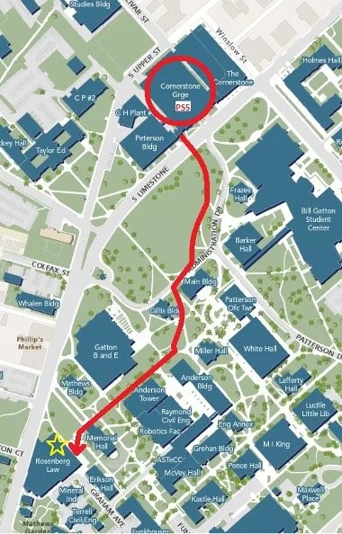 Follow the red line on the map to Rosenberg College of Law.
